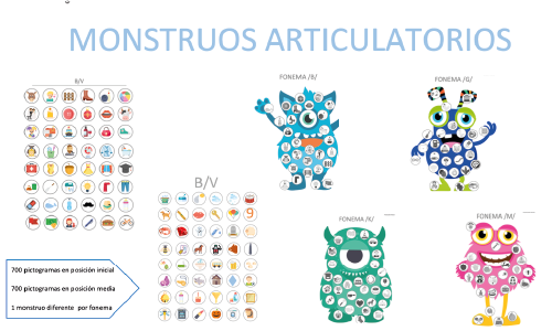 Los Monstruos Articulatorios son una actividad diseñada para trabajar la articulación fonética de los fonemas que presentan mayor dificultad. A través de personajes de monstruos, cada fonema corresponde a un monstruo diferente, haciendo el aprendizaje más motivador. Incluye aproximadamente 1400 pictogramas en posición inicial y media, que permiten múltiples formas de trabajo: